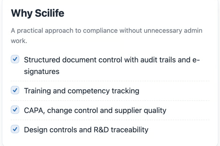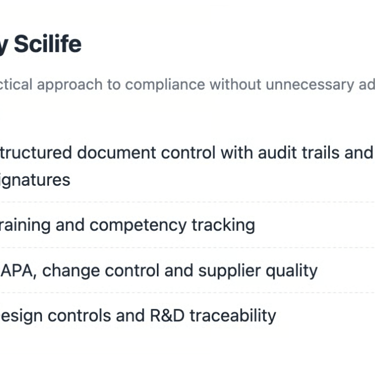Scilife is a connected quality management platform designed for regulated life science organisations. It helps teams manage documents, quality processes and training in on auditable system